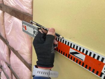 石膏ボードを下地胴縁にビス止めしていきますが、下地の位置がわかるように印をつけていきます。