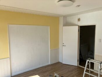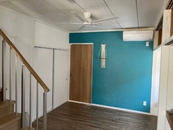 その後、障害者GH事業者がDIYで内装を塗装したり床にクッションフロアを貼ったりして、和室もカラフルで明るいインテリアに改修されていました。