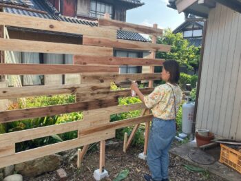 この度、トトロのピザ窯などで使う薪置き場と隣地との目隠し塀を作られたので、塗装をしたいとのご相談があり、余っていた塗料を無償提供させていただきました。