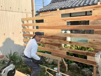 隣地との境に設置した木塀と薪置き場を焼き杉にDIY