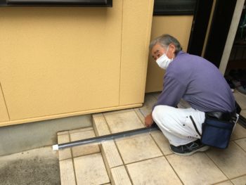 室内手すりに続き玄関ドアの外のポーチ階段部分にも手すりを設置するため土間タイルに穴を空けました。