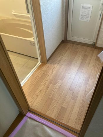 愛知県扶桑町の25年前に新築した高断熱高気密住宅FPの家のユニットバス交換工事で洗面脱衣室の床クッションフロアと壁クロスの貼り替え工事が終わりました。