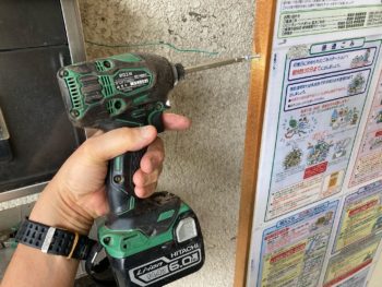 また風で掲示板が倒れるといけないので掲示板の横にビス打ちしてポストと針金で固定しました。