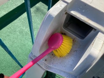 水をかけブラシで擦り付着物の汚れを落とし雑巾で外装や内部の細かい部分も磨きあげました。