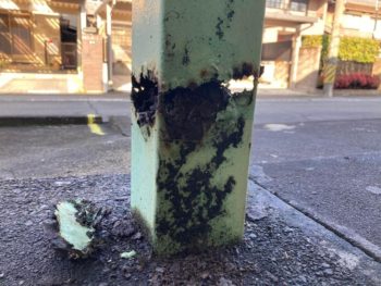 岐阜市の築50年の木造アパートを売買完了して当社で管理することになりましたが,鉄骨階段の柱の根元が腐食して大きな穴が空いて欠損しており危険な状態です。