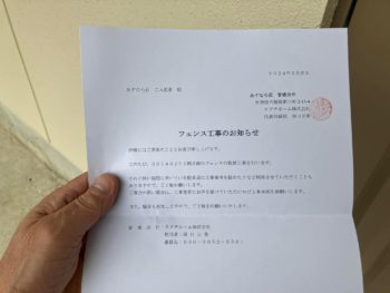 岐阜県関市のアパートを管理していますが、オーナーより裏のフェンスを取り替える工事をするというので、入居者に工事の案内をしました。