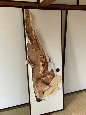襖はボロボロ、畳も擦り切れ、壁の塗膜も爪痕で傷マルケです。