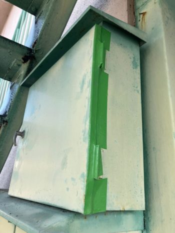 それから配電盤の蝶番が壊れていたのでテープ貼って応急措置をしておきました。