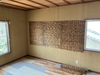 壁の汚れは簾で隠し床もバラバラの柄で貼ってます。