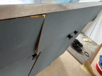 * キッチンの面材: こちらも経年による剥離が見られるため補修予定。