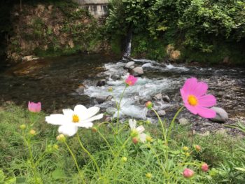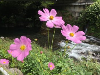 川沿いの道路にはコスモスが満開で清流との風景がマッチしています。